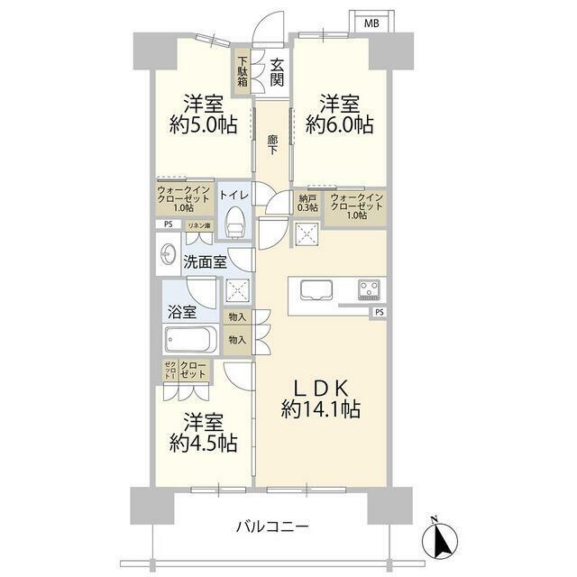 | 間取り | 3LDK(LDK14.1 洋6 洋5 洋4.5) | 主要採光面 | 南 |